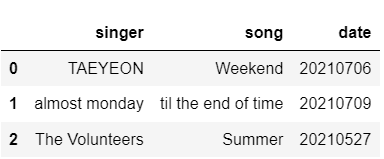 {'playlist': [{'singer': 'TAEYEON', 'song': 'Weekend', 'date': 20210706}, {'singer': 'almost monday', 'song': 'til the end of time', 'date': 20210709}]}