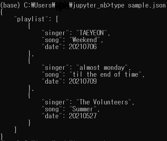 수정한 json을 새롭게 저장한 후, 명령프롬프트(cmd)에서 파일을 확인해보겠습니다. 윈도우에서는 type이라는 명령어를 이용해 json을 읽을 수 있습니다.