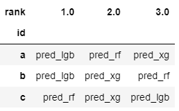 추가로 rank 함수를 이용해 id마다 rf, lgb, xg 중 어떤 모델의 예측값(pred)이 가장 큰지 순위를 매겨보고, pivot 메소드를 이용해 순위에 따라 모델명을 정렬해보며 글을 마치겠습니다.