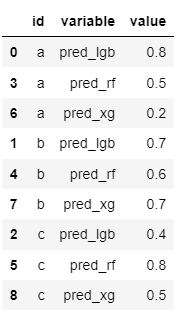 df_long = pd.melt(df, id_vars=['id'], value_vars=['pred_lgb', 'pred_rf', 'pred_xg']).sort_values('id')