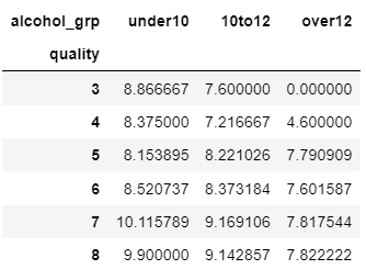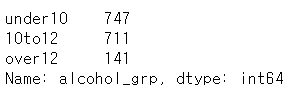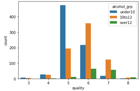 저는 아래 시각화 코드에서 사용하기 위해 임시로 범주형 변수를 생성했습니다. alcohol_grp 칼럼은 alcohol 칼럼의 값이 10 이하이면 under10, 10 초과 12 이하이면 10to12, 12 초과이면 over12 라는 범주값을 갖습니다.