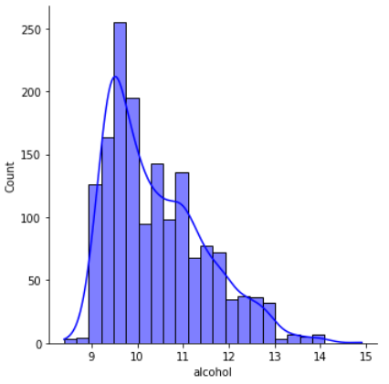 sns.displot(df['alcohol'], kde=True, color='blue')