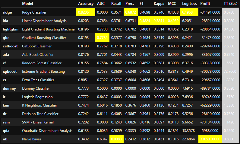 함수를 실행하고 나면 성능지표별로 가장 우수한 점수를 노란색으로 표시해줍니다. 최고의 모델을 선택하는 데 이용할 성능지표 결과를 정렬해서 보여주기까지 하죠. 화면상에 값이 잘 안보여서ㅎ pull을 이용해 결과를 새로 저장하고 살펴볼게요.