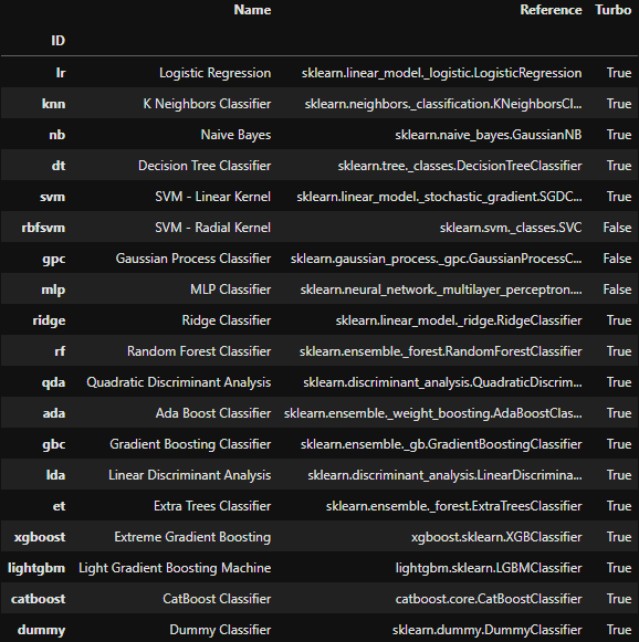 AutoML의 가장 강력한 기능인 모델 비교입니다. 내부적으로 Cross Validation을 이용해 기본적으로 제공하는 모든 모델들을 학습하고 평가한 후, 성능이 가장 우수한 모델을 반환해줍니다. 학습에 사용할 수 있는 모델 후보들은 models() 함수를 이용해 확인할 수 있습니다.(파이썬에 설치된 라이브러리에 따라 목록에 보여지는 모델이 다를 수 있습니다. 필요한 경우 직접 모델 라이브러리를 설치하시고 다시 확인해보면 리스트에 나타날 거예요)