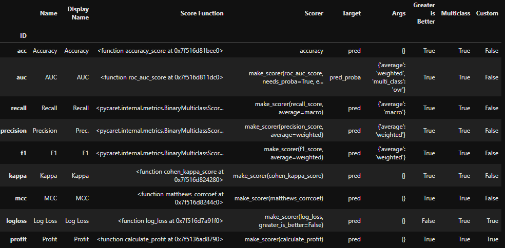 get_metrics 함수를 통해 기존에 제공하고 있는 평가지표들과 분석가가 정의한 평가지표들을 확인할 수 있습니다. 분류 문제의 경우 pycaret은 Accuracy, AUC, Recall, Precision, F1, Kappa, MCC를 기본으로 제공해주고 있네요.