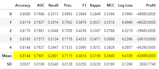 이 실험은 24000개의 전체 데이터 중, 16799개를 학습 및 검증 데이터로, 7201개를 테스트 데이터로 분리했었는데요, predict_model을 통해 성능을 확인하고 각각의 레코드마다 실제값과 예측값을 확인할 수 있습니다.