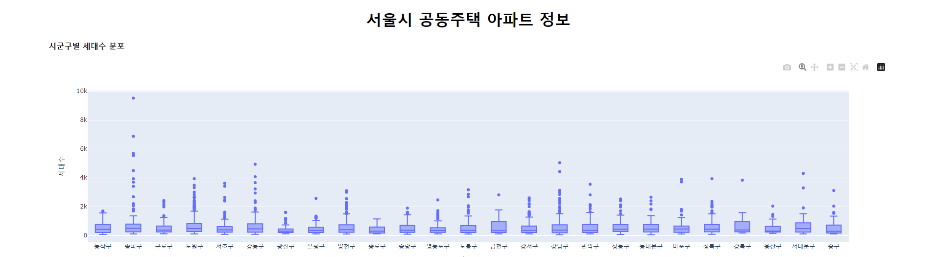 위 코드에서는 H1(헤더와 같은 가장 큰 문자를 작성할 때 사용)와 H4(숫자가 클수록 문자의 크기가 작아짐), dcc(dash core components)의 Graph를 정의하여 어플리케이션을 작성하였다. 그래프는 레이아웃을 정의하기 전에 미리 할당한 정보(시군구별 세대수 boxplot)를 사용한다.