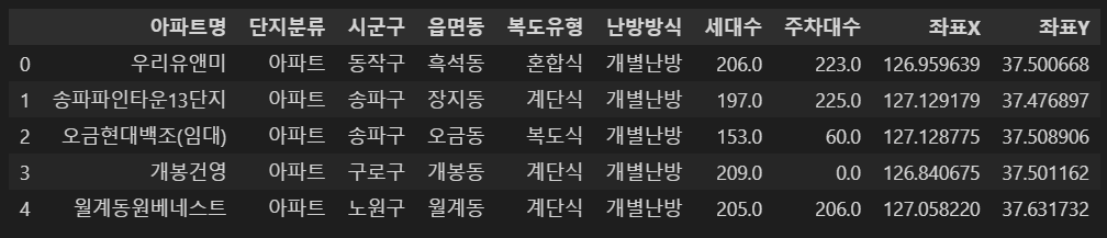 data.columns = ["아파트명", "단지분류", "시군구", "읍면동", "복도유형", "난방방식", "세대수", "주차대수", "좌표X", "좌표Y"]