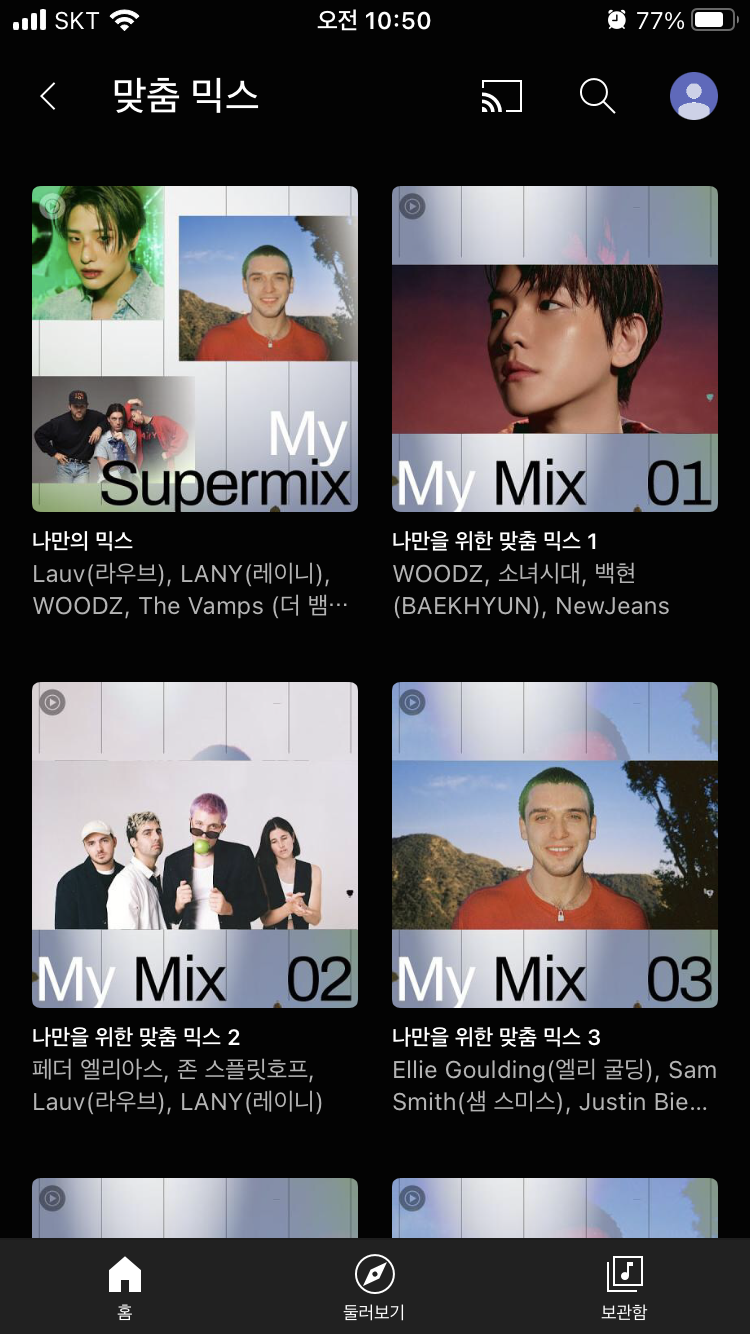 - 맞춤 믹스 서비스의 첫 화면은 어플이 내 취향을 분석하여 만든 여러 재생목록들을 보여주고 있음