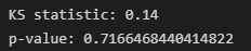 KS 통계량은 0.14, p-value는 0.7으로 계산되었습니다. p-value가 일반적으로 사용되는 유의수준인 0.05보다 커, 두 그룹의 분포가 동일하다는 가설을 기각할 수 없습니다. 따라서 두 그룹의 분포가 동일하다고 결론낼 수 있는 충분한 근거를 확보했다고 할 수 있습니다.