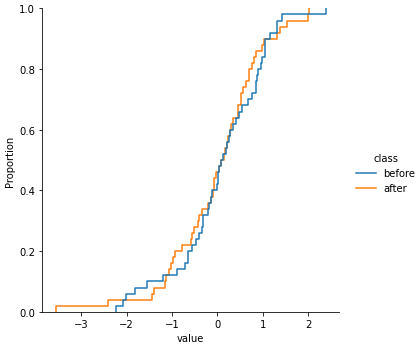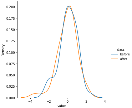그림을 그려서 before과 after 데이터가 어떻게 다른지 확인해 보겠습니다. seaborn의 displot을 이용하여 pdf와 cdf를 그려보겠습니다.