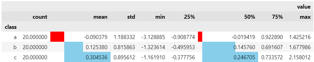 desc.style.bar(subset=[('value', 'mean'), ('value', '50%')], color=['red', 'skyblue'])