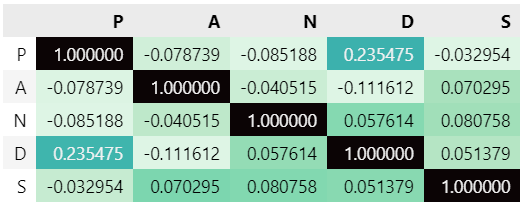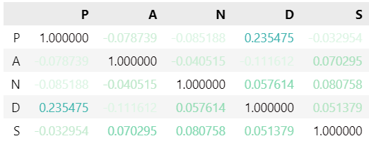 df3 = pd.DataFrame(np.random.randn(100, 5), columns=['P', 'A', 'N', 'D', 'S'])