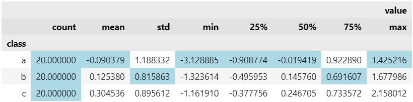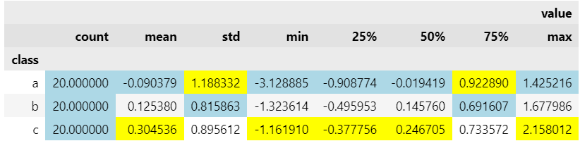 desc.style.highlight_max(axis=0, color='yellow').highlight_min(axis=0, color='lightblue')