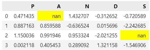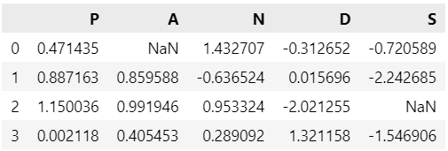df1 = pd.DataFrame(np.random.randn(4, 5), columns=['P', 'A', 'N', 'D', 'S'])