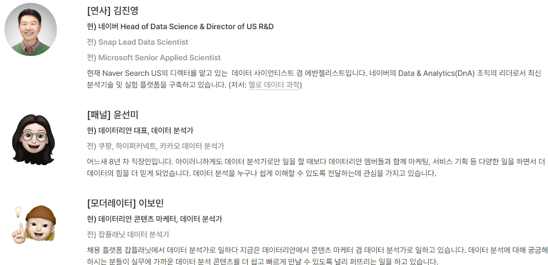 이 되겠습니다. 데이터리안의 세미나를 들어본 건 이번이 2번째인데요, 이렇게 저렴하면서도(얼리버드로 하면 1만 원이었던 것으로 기억합니다) 실무자 관점에서 유익하게 정보를 전달해주는 강의는 많지 않을 것 같습니다. 데이터리안 블로그에서는 지난 세미나 내용들도 공유하고 있으니 입문자든 실무자든 관심이 있는 주제가 있다면 많은 도움이 될 것 같아요. 지난 내용들을 공유하고 있긴 하지만, QnA 같은 실무 중심 내용들은 라이브에서만 들을 수 있는 경우도 있더라고요.(이번 세미나도 마찬가지) 가능하다면 가급적 라이브로 세미나를 듣는 것이 더욱 좋겠습니다.