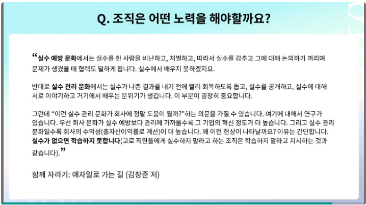 특히 데이터 분석가/사이언티스트가 성장하기 위해서는 개인의 경우 업무 경험을 폭넓게 해보기, 퍼블릭 스피킹 기회가 있다면 해보기, 설득하는 경험을 해보기를 권하신 것, 조직의 경우 양질의 데이터, 분석 인프라, 유의미한 피드백을 줄 수 있는 동료를 갖춰야 한다는 점을 강조하신 것이 기억에 남습니다. 추가로 실수를 예방하는 것이 아니라 관리함으로써 학습하게 된다며 도서 하나를 공유해 주셨는데요. 일도 결국 사람이 하는 것이어서 사람이 제일 중요하다는 것을 깨닫고 있어서, 공유해주신 도서가 아주 유용할 것 같습니다. 시간 내서 꼭 읽어봐야겠어요.
