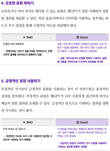 이후에는 파트2 내용의 기저가 되는 프롬프트 원칙과 프레임워크에 대해 설명합니다. 이 책의 정수라고 할 수 있습니다. 막연하게들 아시는 내용이겠지만 명확하게 좋은 예시와 나쁜 예시를 함께 비교 설명해주어서 왜 우리가 프롬프트를 잘 작성해야 하는지 이해하기 쉽습니다. 상대가 잘 알아듣게 맥락에 맞게 질문하는 것은 사람 간의 대화에서도 중요한 요소이죠. 비록 기계일지라도 마찬가지입니다.