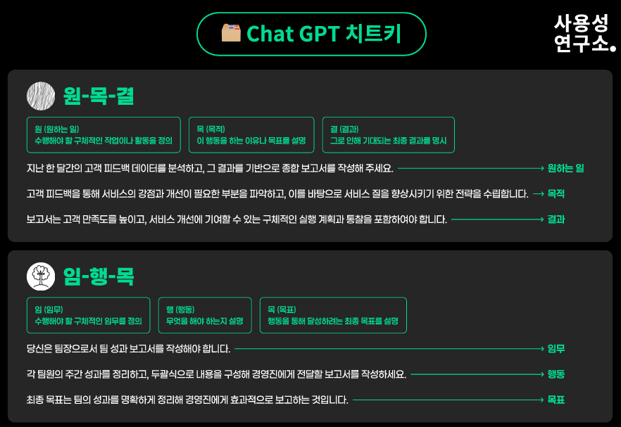 일상생활에서 사람들이 지피티를 사용하는 목적이야 다양하겠습니다만, 업무에서 그 목적은 크게 다르지 않을 것 같습니다. 엑셀 함수를 물어본다거나, 보고서나 기획서 초안을 작성하게 하는 데에 활용하겠죠. 단순하게 시키고 싶은 작업을 서술식으로 던져보는 것보다는 구체적인 목표와 원하는 출력 형식을 제공해야 원하는 대로 결과도 얻을 수 있습니다. 생각보다 많은 분들이 지피티에게 제대로 된 요구사항을 제시하지 않고도 원하는 바가 나오길 기대하더라구요. 지피티는 사람이 아니기에 눈치를 챙기기는 어려우므로(가끔은 사람도 헷갈려하지요) 제대로 사용하는 방법을 알아두면 보다 빠르게 원하는 것을 얻을 수 있지 않을까요?(더불어 칼퇴도요) 저도 그런 목적으로 도움을 받고자 이번 도서를 선택하였습니다.