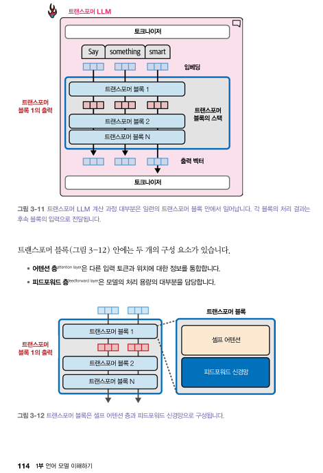 이미 앞서 언급했지만, 트랜스포머 같은 핵심 기술들을 이미지로 설명해주는 구성이 특히 마음에 들었다. 아무래도 텍스트보다 시각적으로 보는 게 이해에 훨씬 도움이 되는데, 이 책은 그 점을 잘 챙겨준다.