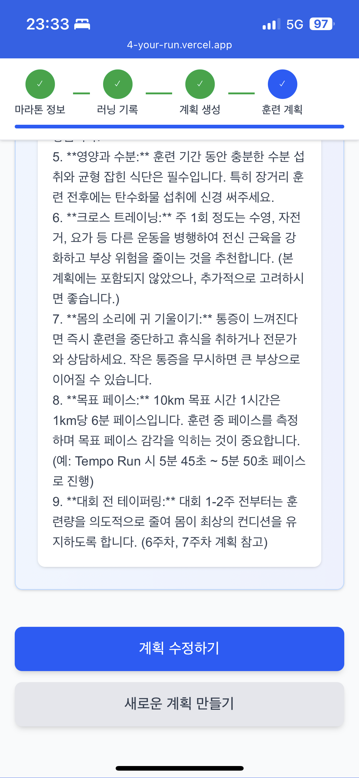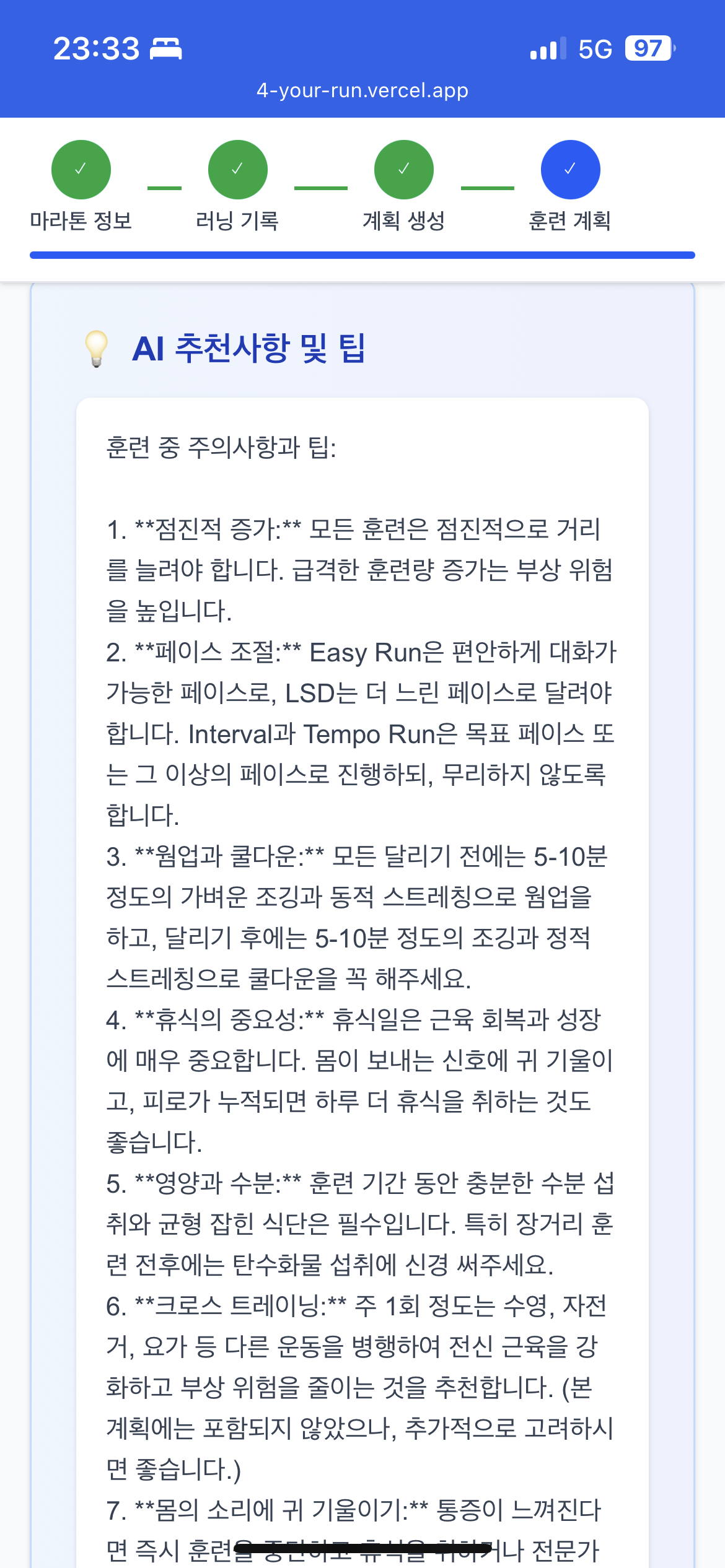 - 사용자가 참가할 마라톤 정보를 입력하면 최근 러닝 기록과 비교해 생성형 AI(Gemini)를 활용한 맞춤형 훈련 계획을 주차별로 제공