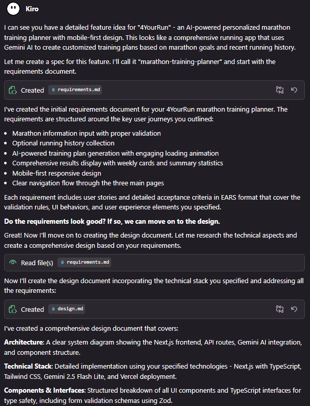 기획서를 던져주었더니 별다른 설명을 하지 않았음에도 Spec 모드여서 그런지, 바로 내용을 이해하고 계획을 세웠다. Kiro는 바이브코딩을 시작하기 전에 requirements, design, tasks 파일을 생성하고 사용자에게 검토를 요청한다. 물론 맘에 들지 않는 건 직접 수정해도 된다. 작성된 tasks 중에 주차별 목표 거리와 누적 거리를 시각화하는 단계가 있었는데, 이해하기도 좋고 결과도 더 예쁘겠지만 불필요하게 시간이 많이 들 것 같고 왠지 오류도 잦을 것 같아서 해당 단계는 직접 삭제했다.
