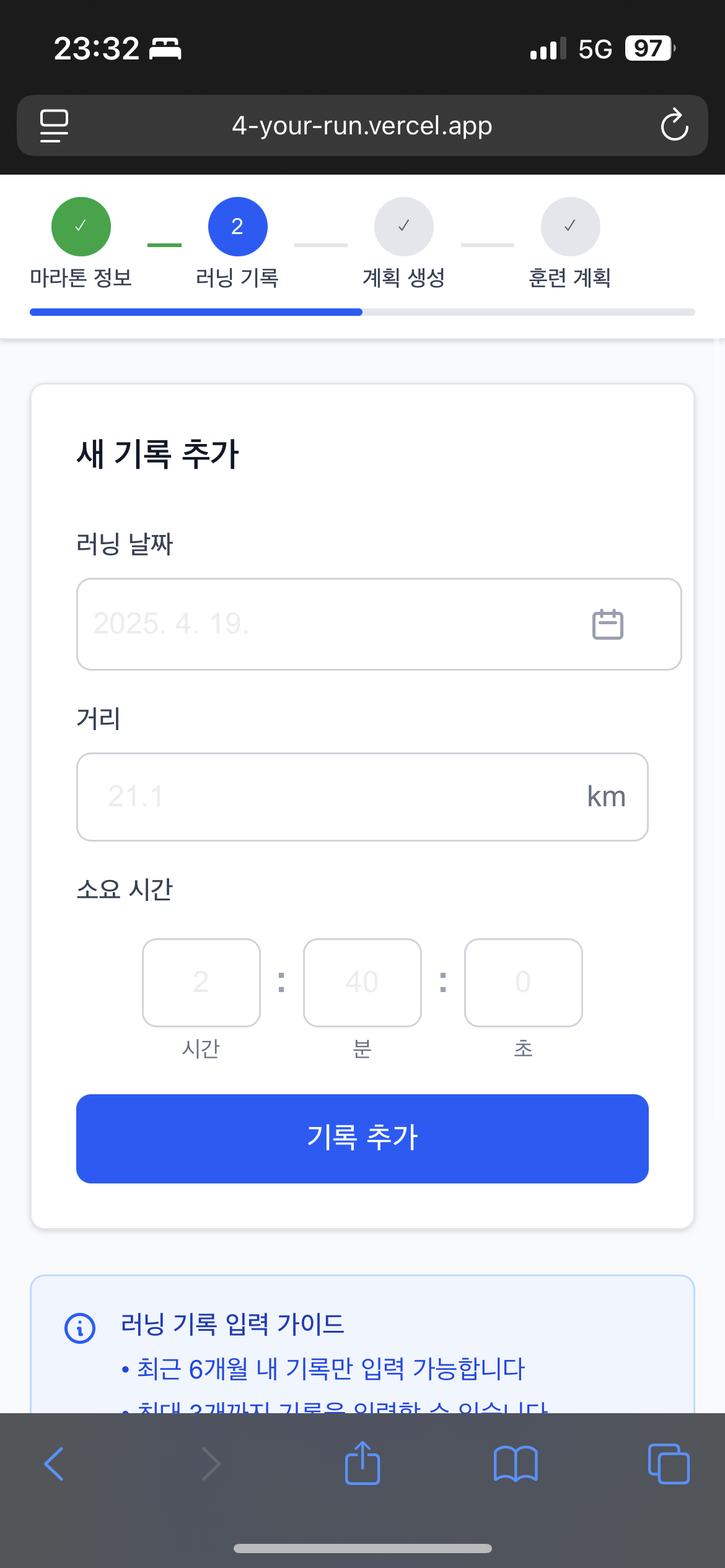 📍Step 2: 최근 러닝 기록 입력