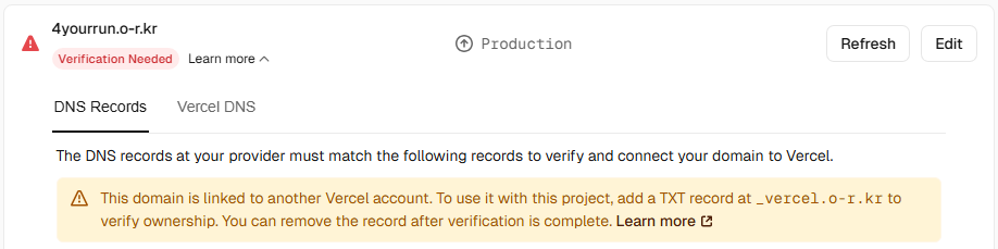 최초 시도는 역시나 실패했다. 인증을 해야한다면서 CNAME이나 TXT와 같이 DNS 고급설정 값을 주는데, 내도메인.한국의 도메인 설정 페이지에서 vercel에서 주는 이 값을 입력해야 한다. 그런데 나는 이 값 뿐만 아니라 IP연결에 내 랩탑의 공인 IP를 넣어서 계속 연결에 오류가 났던 것으로 추정한다. 배포는 vercel에서 하는데 왜 내 ip를 넣었던 건지..? 아무튼 하라는 인증만 하면 된다. . 성공했다면 몇 초 지나지 않아 바로 파란색 체크를 확인할 수 있다.