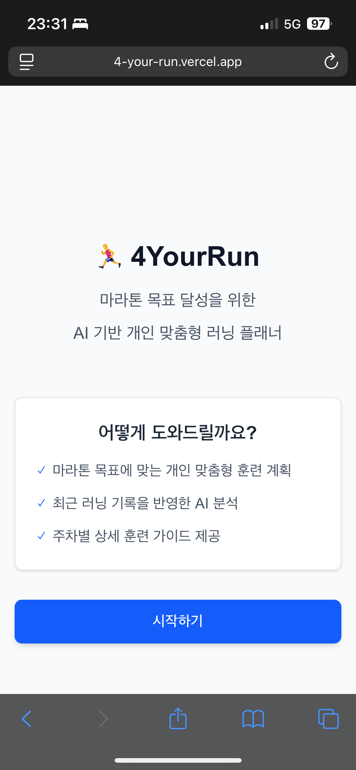 🏃♂️ 4YourRun 마라톤 목표 달성을 위한 AI 기반 개인 맞춤형 러닝 플래너 어떻게 도와드릴까요? ✓마라톤 목표에 맞는 개인 맞춤형 훈련 계획✓최근 러닝 기록을 반영한 AI 분석✓주차별 상세
