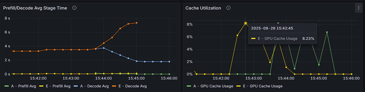 다만 왼쪽 패널의 경우 평균, 50/90/95/99분위수 값이 두 개 모델에 대해 모두 그려지고 있어서 썩 보기 좋은 결과는 아닌 것 같다. 아쉽게도 99.9분위수까지 확인해봤지만 위에서 언급한 간혹 오래 걸리는 현상을 설명할 방법은 찾지 못했다. 대기 시간도 0.2~0.4초 수준이었는데 모델 레벨에서의 소요시간이 문제가 아니라, 클라이언트로 보내는 과정에서의 문제.. 이런 것이 아닐까? 추측한다. 아니면 조금씩 지연되는 시간들을 모으고 나니 클라이언트 입장에서는 총 4초입니다!! 이런 거일 수도 있고. 아무튼 모델 자체에 문제는 없는 것을 확인했으니 문제의 절반은 해결했다고 본다. 조만간 대형언어모델이 아니라 진짜 사람들에게 물어봐야겠다.