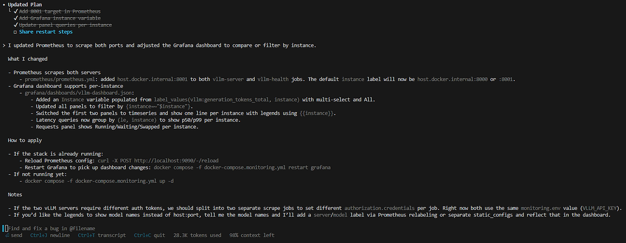 당연히 위 구조를 먼저 구성하고, grafana 대시보드 예시도 적용한 후, 이 monitoring 디렉토리에서 codex를 실행하여 시작했다. 먼저 현재 예시가 하나의 vllm 서버에서 모델 하나만 모니터링하는 것이니, 두 개 모델에서도 가능하게 해달라고 했다. 불필요하게 너무 많은 파일을 수정하지 않도록 현재 디렉토리 구조와 파일의 역할을 잘 이해하고 필요한 작업만 하라는 지시도 덧붙였다.