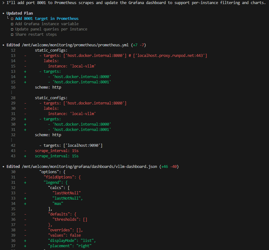문제는 지금 모델 2개를 서빙하는 상황이었고, 각각을 대시보드에서 표현해야 했다. 많은 요청을 던졌을 때 간혹 시간이 오래 걸리는 경우가 있어서 이런 이상치를 관측할 수 있는 패널도 필요했다. vllm에서 제공하는 예시는 1500 라인에 달했고 하나하나 이해하며 수정하기엔 너무 오랜 시간이 걸릴 것이 당연했기 때문에 Codex의 힘을 빌렸다.