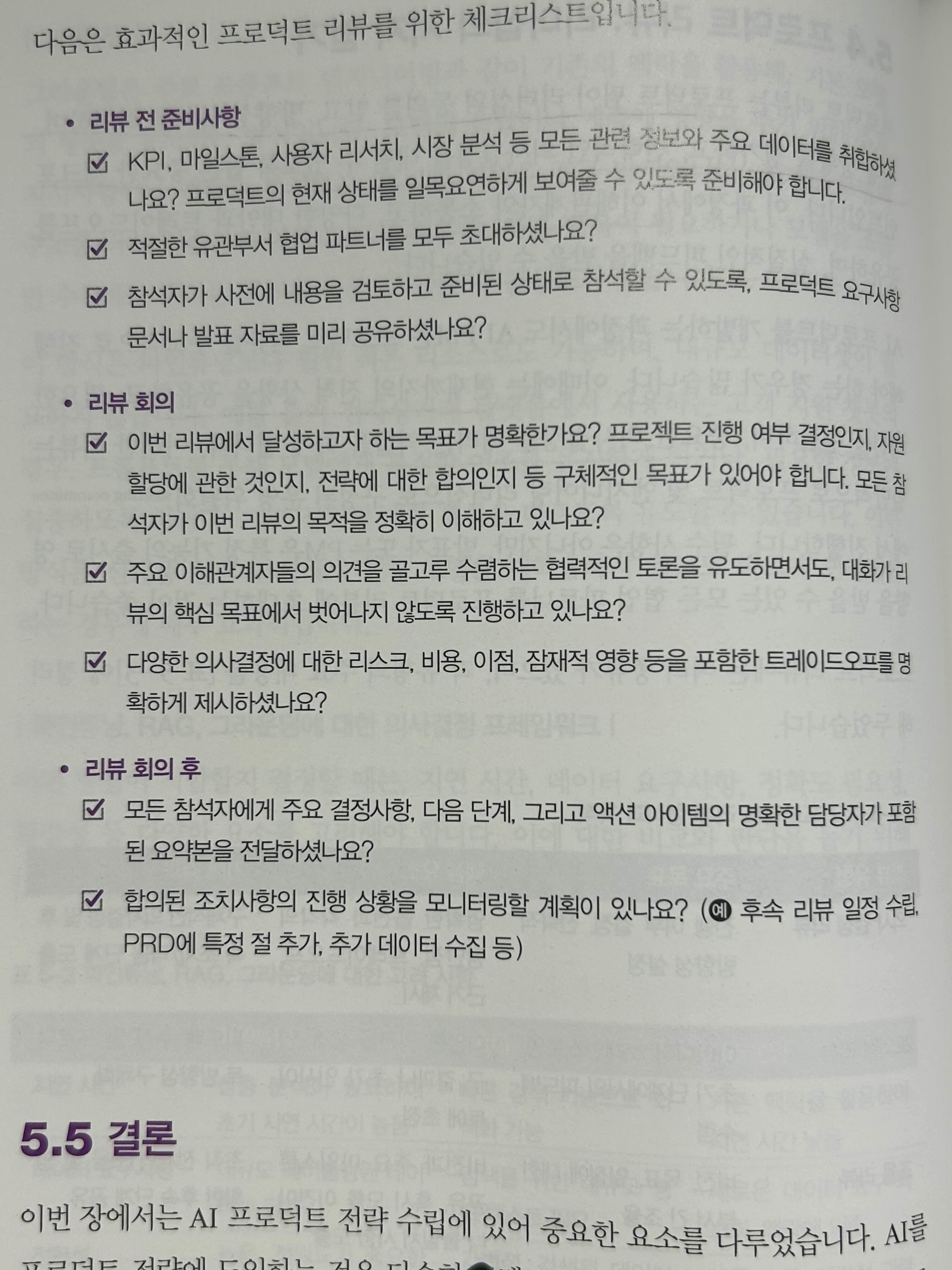 전반적인 개발 라이프사이클은 기존 소프트웨어 개발과 유사한데요. 최초 출시 시, 모든 것을 AI스럽게 자동화하는 것보다는 핵심 가치 제안에 집중하라는 조언이 와닿았습니다. ChatGPT가 등장하고 이후 AI Agent가 나오면서 비전문가들은 간단한 사용자 프롬프트만으로도 많은 것을 알아서 해줄 것이라는 기대를 안고 있는데요. 우리가 서비스에 적용하는 언어모델은 GPT가 아니라 기대하는 만큼의 성능이 항상 나오지는 않습니다(12페이지에서도 저자는 "AI 시스템은 확률적"이라고 강조했습니다). 심지어 개발 시간도 부족하다면 완전 자동화된 서비스를 시장에 내놓겠다는 꿈은 AI 개발 현실을 이해하지 못한 허황된 기대라고 봅니다. 실무 개발자로서 기획자들에게 이런 한계를 미리 분명하게 전달해야겠다고 반성도 했고요, 프로덕트 개발 과정에 있어 초반부터 구성원들 간에 이야기를 많이 나누면서 명확한 목표와 핵심 가치를 정의하고 현실적인 계획을 수립하는 것이 중요하다고 다시한번 깨달았습니다.
