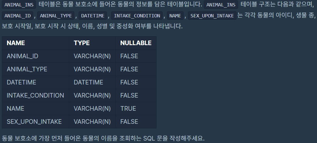 우선 서브 쿼리를 사용하여 보호 시작일로 오름차순 정렬합니다. 보호 시작일로 정렬된 이름 칼럼이 저장된 서브 쿼리로부터 WHERE ROWNUM = 1을 통해 가장 먼저 들어온 동물의 이름이 있는 첫번째 행만 출력하게 됩니다.