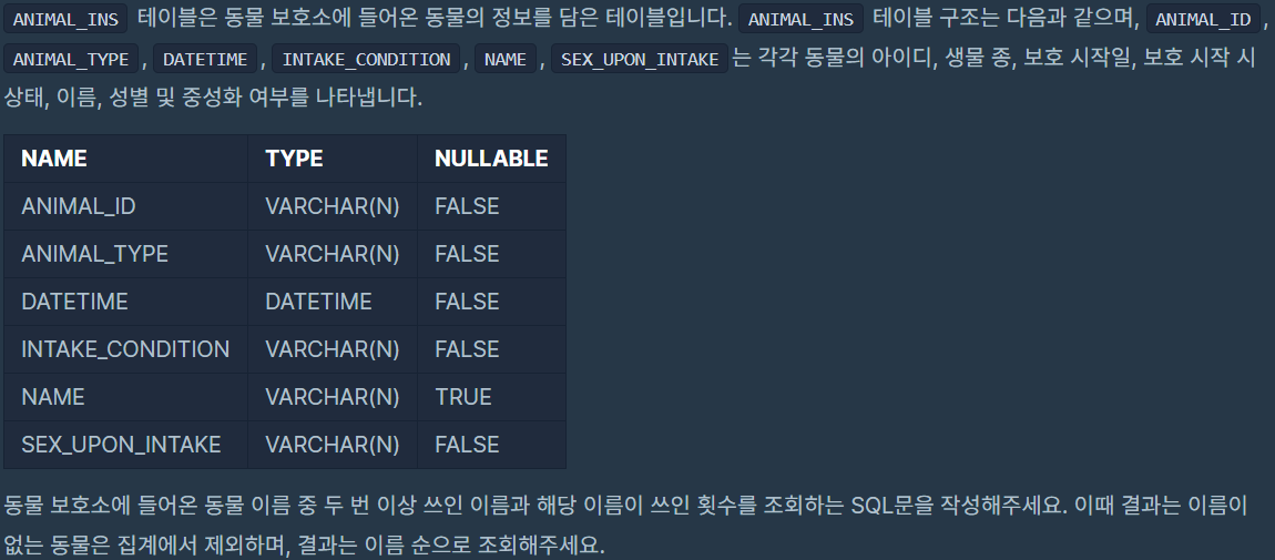 이름이 없는 동물은 집계에서 제외하므로 WHERE절을 사용하여 NAME이 NULL인 아닌 경우만 추출합니다. 이름으로 그룹화한 후, HAVING절을 사용하여 이름마다 집계한 행의 개수가 2이상인 경우만 추출합니다. 결과를 이름 순으로 조회하기 위해 ORDER BY절을 사용하였습니다.
