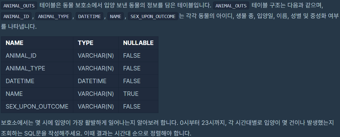 서브쿼리에서 보호 시작일로부터 시간을 추출하는데요 00시~23시 형태로 출력하기 위해 'HH24' 포맷을 사용하였습니다. 이후 WHERE절을 사용하여 9시부터 19시까지에 해당하는 행만 추출합니다. GROUP BY절로 시간별로 그룹화한 후, COUNT 함수를 사용하여 시간별로 발생한 입양건수를 집계합니다.