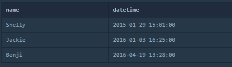 SELECT NAME, DATETIME