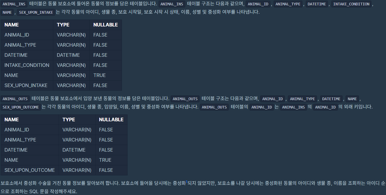 ANIMAL_ID를 기준으로 INNER JOIN을 사용해 두 테이블을 조인합니다. 중성화를 거치지 않은 동물은 Intact, 중성화를 거친 동물은 Spayed 또는 Neutered라고 표시되어 있다고 하네요. WHERE절에서 LIKE 연산자를 사용하여 보호소에 들어올 당시에는 중성화되지 않았지만 나갈 때에는 중성화된 경우만 추출합니다. 와일드 카드인 %는 개수에 관계없는 모든 문자를 의미합니다. 'Intact%'는 Intact로 시작하는 모든 값을 추출합니다. 중성화를 거친 동물은 Intact라고 표시되어 있지않기 때문에 간단하게 NOT LIKE를 사용하였습니다. 추출 후 ID순으로 정렬합니다.