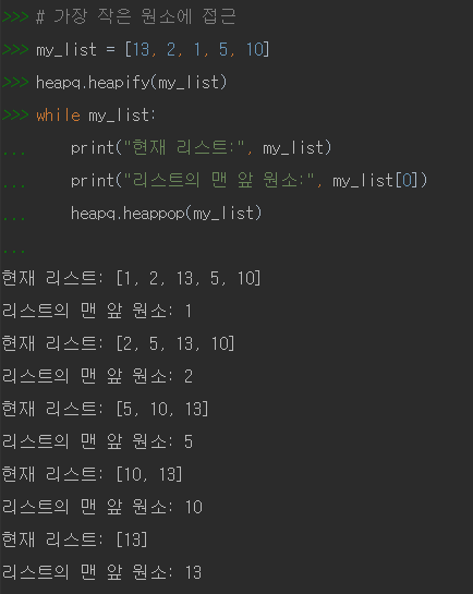 원소 추출 : heappop(heap)