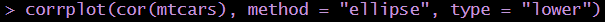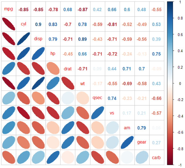 네 변수의 상관성을 원형의 크기와 색을 이용하여 나타냈습니다. 이 시각화는 변수의 종류가 많은 경우에 유용하겠네요. mtcars 데이터를 이용하여 적용하면 다음과 같이 나타낼 수 있습니다.