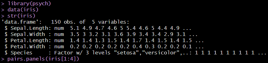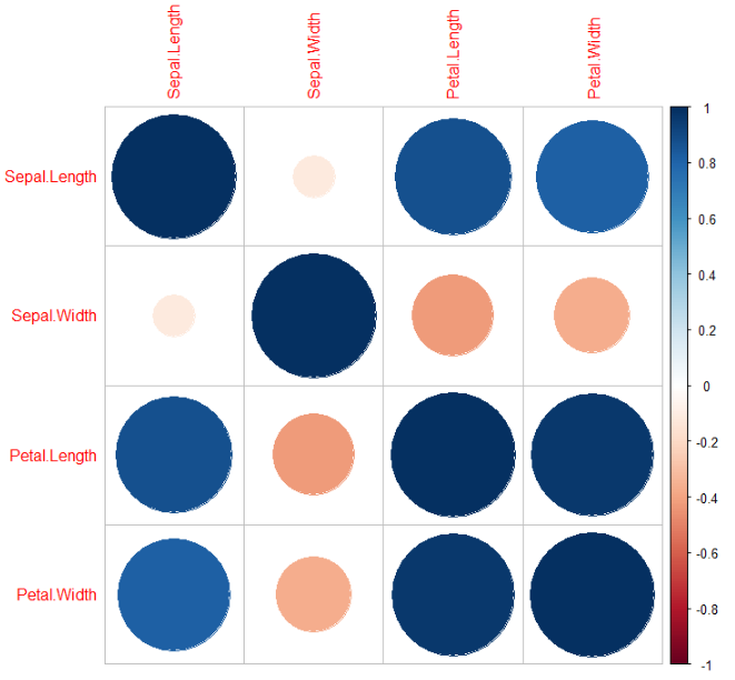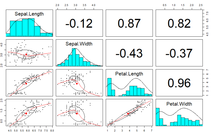 아이리스 데이터의 1열~4열은 연속형 자료이며, 5열에는 꽃의 종류(setosa, versicolor, virginica)가 요인형 자료로 입력되어 있습니다. 상관분석은 연속형 자료에 대해서만 수행되므로 1열부터 4열만 선택하여 시각화했습니다.
