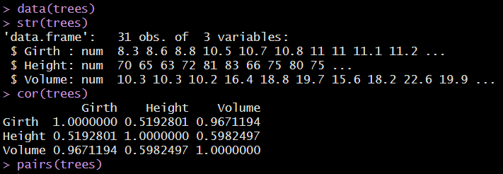 R에서 제공하는 trees 데이터를 사용합니다. 세 변수 Girth, Height, Volume간의 피어슨 상관계수와 산점도는 다음과 같이 확인할 수 있습니다. cor() 함수는 피어슨 상관계수를 디폴트로 수행합니다.