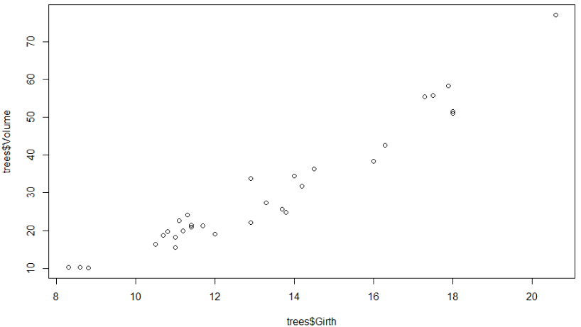 이 관계를 객관적으로 파악하기 위해서는 상관계수(correlation coefficient)로 상관성의 정도를 정량화해야 합니다. 상관계수는 -1에서 1 사이의 값을 갖는데요, 절댓값이 클수록 강한 선형적인 관계를 갖는다고 하며, 절댓값이 작아 0에 가까울수록 약한 관계를 갖는다고 합니다. 부호가 양수이면 양의 상관관계, 음수이면 음의 상관관계를 의미합니다. 양의 상관관계란 한 변수가 증가하면 다른 변수 역시 증가하는 관계를, 음의 상관관계란 한 변수가 증가하면 다른 변수가 감소하는 관계를 뜻합니다. 위 산점도는 Girth가 증가함에 따라 Volume도 증가하는 양의 상관관계를 보여주고 있습니다.