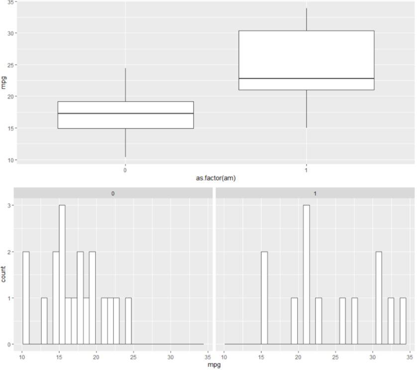 | > library(ggplot2) > library(gridExtra) > data(mtcars) > g1 <- ggplot(mtcars, aes(as.factor(am), mpg)) + geom_boxplot() > g2 <- ggplot(mtcars, aes(mpg)) + geom_histogram(fill = "white", color = "grey30") + + facet_wrap(~ am) > grid.arrange(g1, g2, ncol = 1) |