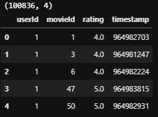 사용자마다 관람한 영화에 대해 평점을 남긴 데이터는 ratings.csv에 저장되어 있습니다. 사용자들이 모든 영화를 관람하지는 않기 때문에 (사용자 수 x 영화 수)만큼 데이터가 존재하지는 않습니다.