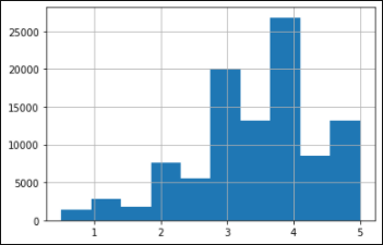 평점의 평균은 3.5점이고, 대체로 사용자들은 2.5점에서 4.5점 사이의 점수를 준다는 것을 알 수 있습니다. 히스토그램으로 빈도도 살펴볼게요.